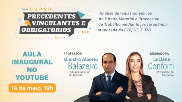 A aula inaugural, no dia 14 de maio, às 19 horas, será transmitida pelo canal da TV Anamatra no Youtube e será conduzida pelo ministro do Tribunal Superior do Trabalho (TST) Alberto Bastos Balazeiro. Confira a programação completa.