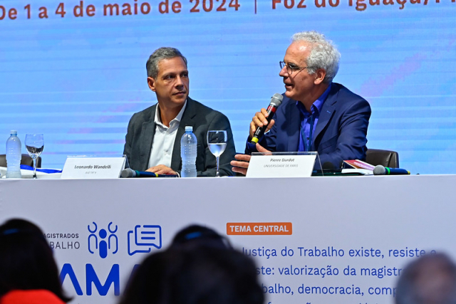 A mesa foi presidida pelo juiz Leonardo Viera Wandelli (Amatra 9/PR), que destacou a relevância das reflexões apresentadas por Pierre Dardot e instigou os presentes a refletirem sobre o papel da tecnologia. ‘Aquilo que nos caracteriza é justamente a nossa capacidade de julgar e devemos ponderar diante de todo o avanço tecnológico se não estamos sendo conduzidos à submissão pelas máquinas’.
