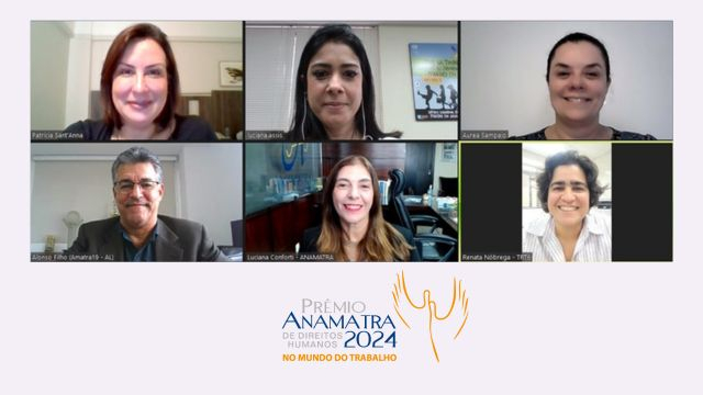 A reunião da Comissão Julgadora contou com a participação da presidente da Anamatra, Luciana Conforti, da diretora de Cidadania e Direitos Humanos, Patrícia Sant’Anna, das magistradas Áurea Sampaio e Renata Nóbrega, integrantes da Comissão de Direitos Humanos da Anamatra, e do juiz Alonso Albuquerque Filho, presidente da Amatra 19 (AL), indicado pelo Conselho de Representantes da Associação.