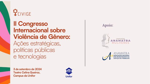 O II CIVIGE conta com o apoio institucional da Comissão Anamatra Mulheres e da Associação Nacional dos Magistrados da Justiça do Trabalho (Anamatra). A diretora de Cidadania e Direitos Humanos da Anamatra, Patrícia Sant’Anna, participará do evento. A magistrada será uma das painelistas do II CIVIGE com o tema “Rede de enfrentamento à violência contra mulheres e meninas”.