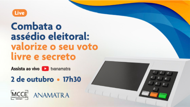 A Associação Nacional dos Magistrados da Justiça do Trabalho (Anamatra) realizará, nesta quarta (2/10), live para debater o conteúdo da cartilha ‘Combata o assédio eleitoral: valorize o seu voto livre e secreto’, desenvolvida pela Associação, em parceria com o Movimento de Combate à Corrupção Eleitoral (MCCE).
