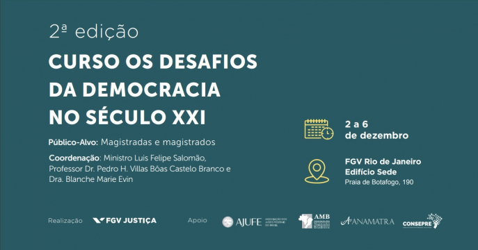 A Fundação Getúlio Vargas (FGV), com sede na cidade do Rio de Janeiro, realizará, entre os dias 02 e 12 de dezembro, a segunda edição do curso "Os desafios da democracia no século XXI". Coordenado pelo vice-presidente do Superior Tribunal de Justiça (STJ), ministro Luís Felipe Salomão, a iniciativa conta com o apoio institucional da Anamatra. Também coordenam a formação o cientista político e professor no Instituto de Estudos Sociais e Políticos (Iesp) da Uerj, Pedro H. Villas Bôas Castelo Branco, e Blanche Marie Evin, doutora em Ciência Política pela UERJ.