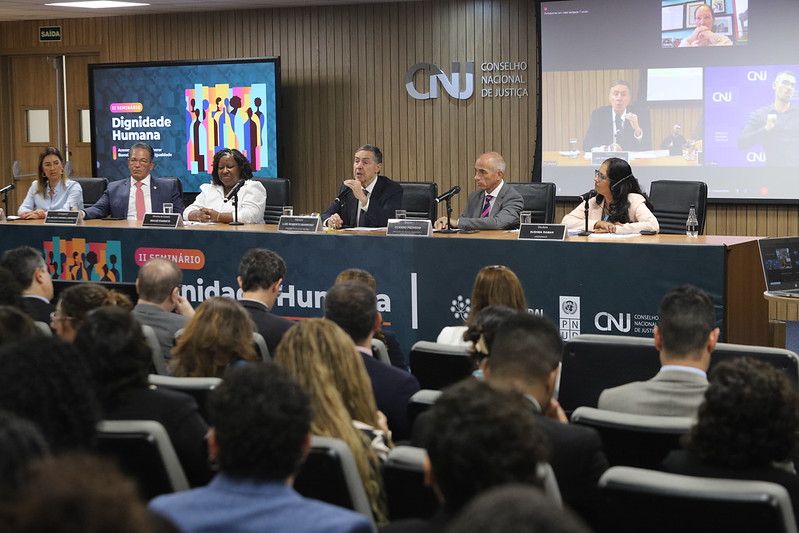 A mesa da abertura contou com a presença da ministra de Direitos Humanos e da Cidadania (MDHC), Macaé Evaristo, do representante residente no Brasil do Programa das Nações Unidas para o Desenvolvimento (Pnud), Cláudio Providas, do corregedor Nacional de Justiça, ministro Mauro Campbell, e da conselheira do CNJ Renata Gil.