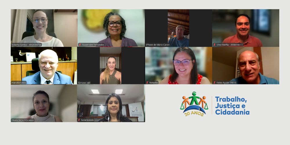Participaram da reunião as(os) seguintes magistradas(os): a coordenadora do TJC, Rosemeire Lopes Fernandes (aposentada -Amatra 5/BA), Fábio Bueno de Aguiar (Amatra 15/ Campinas), Poliana Rocha de Sá (Amatra 13/PB), Marcelo Garcia Nunes (Amatra15), Mário Caron (aposentado - Amatra 10/DF-TO), Natasha Schneider (Amatra 8/PA-AP), Simone Medeiros Jalil (Amatra 21/RN) e Vitor Graciano de Souza Maffia (Amatra 11/AM-RR).